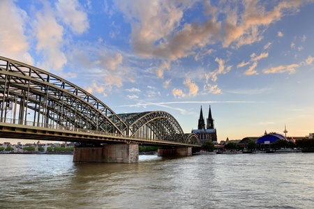 Cologne Cathedral church Germany skyline city town sunset bridge evening