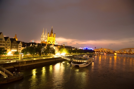 The twin gothic spires of Cologne Cathedral along side the Hohenzollern Bridge and river cruise boats at night on the River Rhine, Germany, Europe