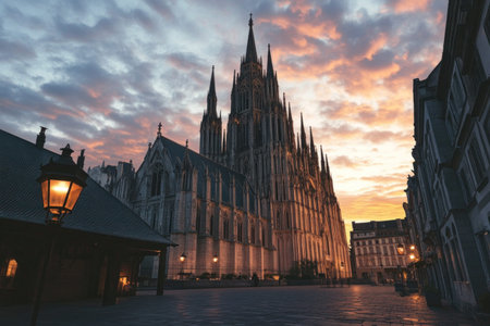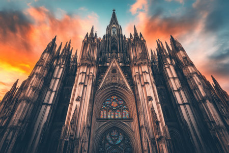 A gothic-style cathedral facade with intricate details and dramatic lighting at sunset.
