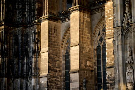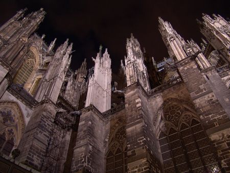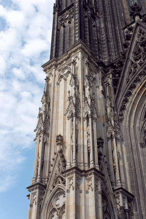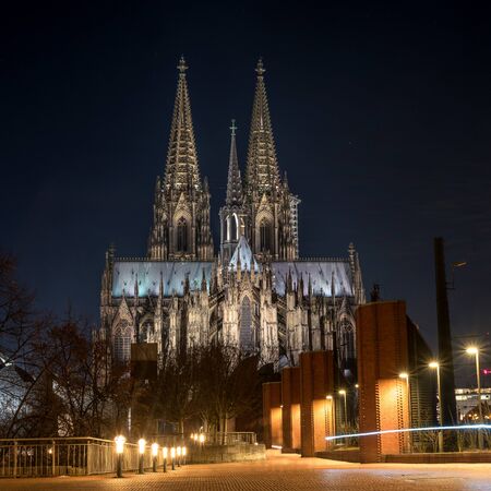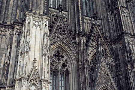 night scene, details of the facade of the Gothic cathedral in the city center, Cologne Dome Church at Germany City.