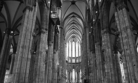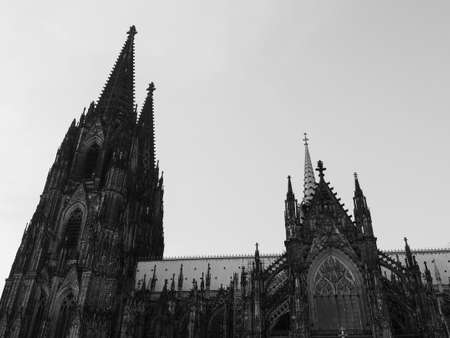 KOELN, GERMANY - CIRCA AUGUST 2019: Koelner Dom Hohe Domkirche Sankt Petrus (meaning St Peter Cathedral) gothic church in black and white