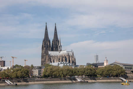The Cologne Cathedral from the other side of the Rhine with TV Tower in the background in Cologne Germany