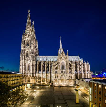 Panoramic view of Cologne Cathedral at nightfall, Germany.