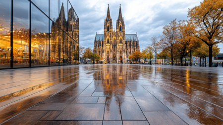 A Stunning cathedral reflecting on wet pavement under dramatic sky