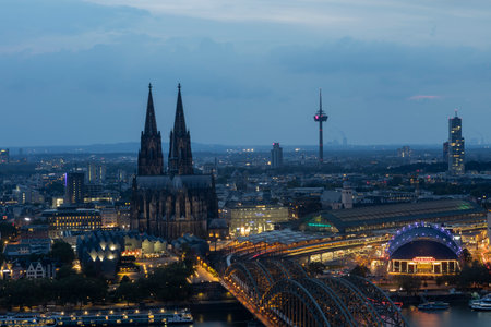 Cologne Cathedral and Hohenzollern Bridge at sunset, nighttime. Photo for postcard