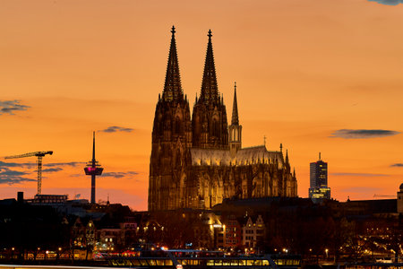 Sunset time. Cologne Dom and Rheine in Germany. Skyline of Cologne with Cologne Cathedral
