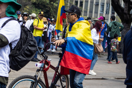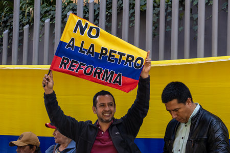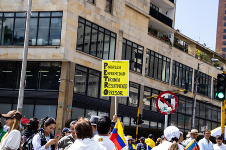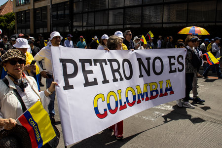BOGOTA, COLOMBIA - April 21, 2024. March asking for Gustavo Petro impeachment. Peaceful protest march in Bogota Colombia against the law reforms of Gustavo Petro government.