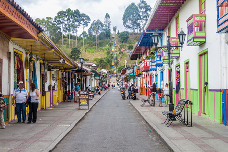 SALENTO, COLOMBIA - SEPTEMBER 7, 2015: Colorful decorated houses on Calle Real (Royal Street) in Salento village, Colombia