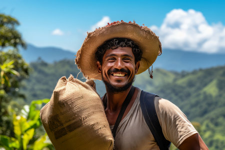 Coffee farmer smiling. natural leaf seed. Generate AI