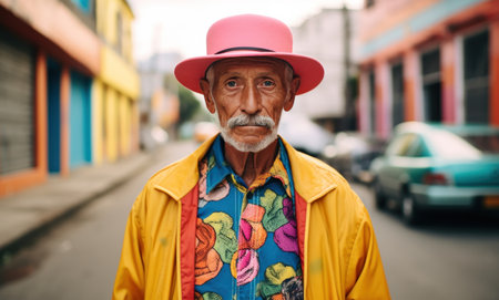 portrait of elderly man standing on the city street in colorful jacket and hat.