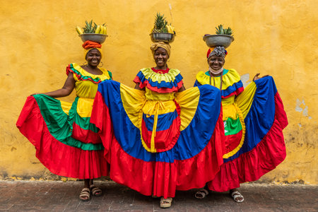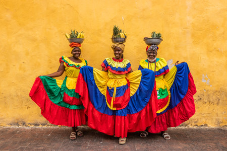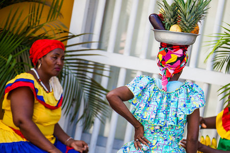 CARTAGENA DE INDIAS, COLOMBIA - MARCH 6, 2023: Palenquera women wearing traditional costume sell fruits in the center of Cartagena.
