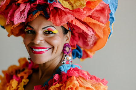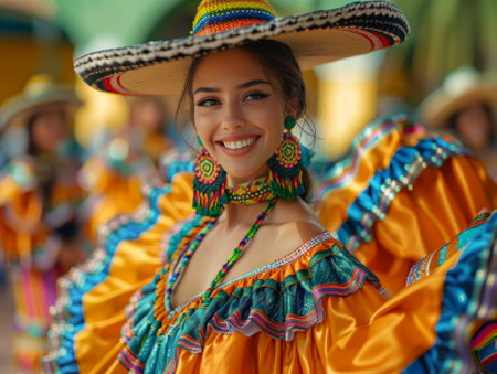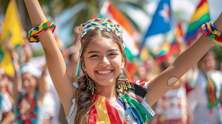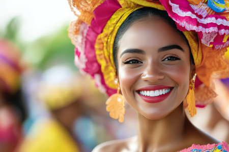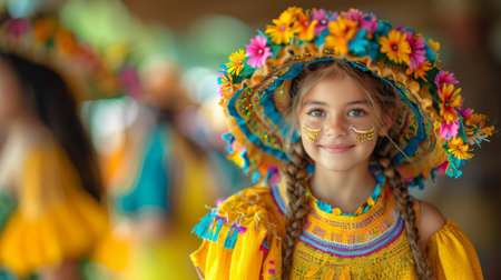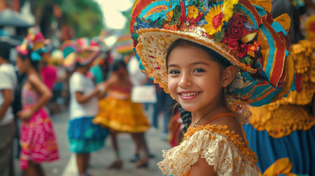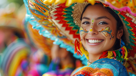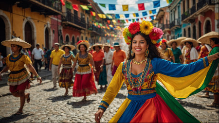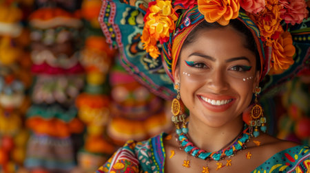 A woman in vibrant traditional clothing with a flower headdress smiles warmly. She is part of a festive scene. Concept of cultural celebration. Hispanic Heritage Month, celebrating culture.