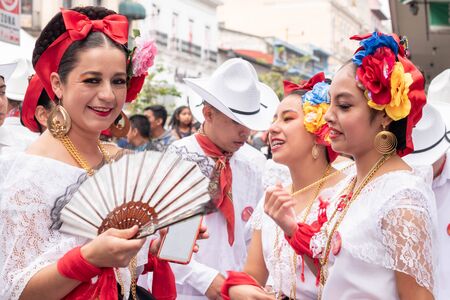 XALAPA, VERACRUZ, MEXICO- NOVEMBER 24, 2019: Young women dressed with traditional clothes during the Record La Bamba 2019 in Xalapa, Veracruz, Mexico