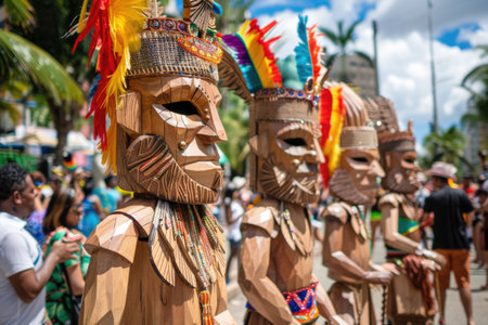 Lively and Vibrant Street Carnival with Colorful Costumes Masks Headdresses and Energetic Performers Entertaining the Crowd