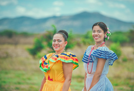 Two smiling Hispanic girls wearing cultural folkloric costumes outdoors. Portrait of two Hispanic women wearing cultural folkloric costume in a field