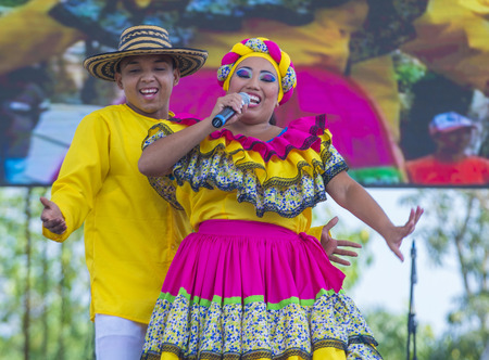 Nova Petropolis, Brazil - July 20, 2019. Colombian folk dancers performing a typical dance on 47th International Folklore Festival of Nova Petropolis. A lovely rural town founded by German immigrants.