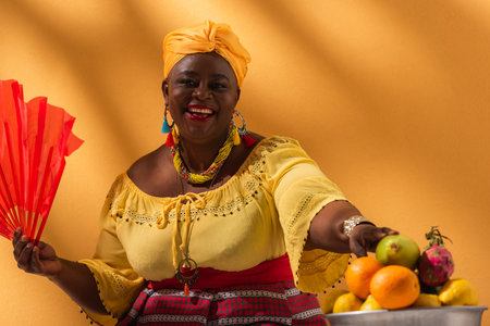 smiling middle aged african american woman touching fruits and holding fan on orange