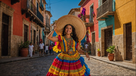 A woman wearing a vibrant Mexican costume, showcasing colorful patterns and traditional attire.. Generative AI