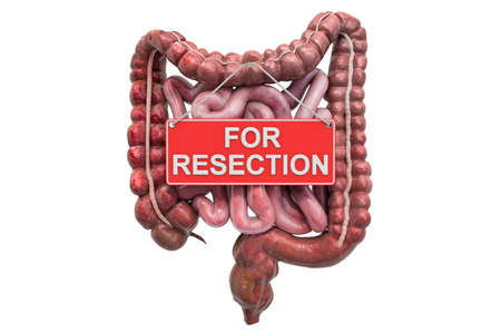 Human intestines with For Resection hanging sign, 3D rendering isolated on white background