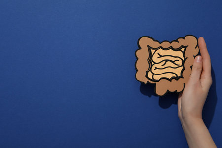 A woman holds an anatomical illustration of the human digestive system, highlighting the large and small intestines. this image can be used for health, medical, and wellness content related to digestion and gut health.