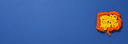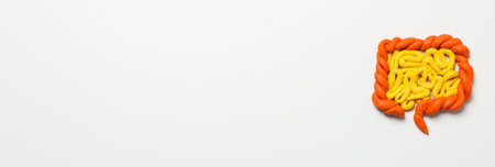 A large intestine shape made from plasticine over a gray background. Treatment and prevention of constipation and diarrhea. Intestinal microflora and probiotics. Space for text. Top view