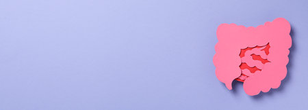 Mock-up of a human intestines on a blurry medical background. A healthy digestive system. Intestines and probiotics. Treatment of dysbacteriosis. Care of health.