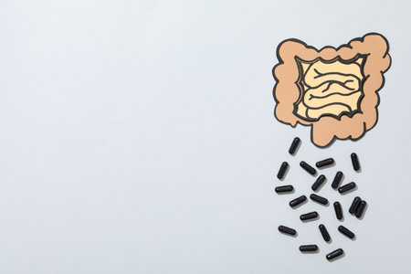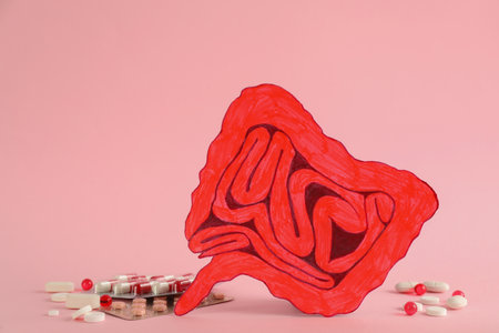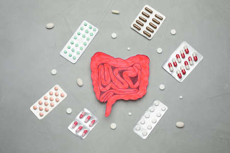 Paper cutout of small intestine and pills on light gray background, flat lay
