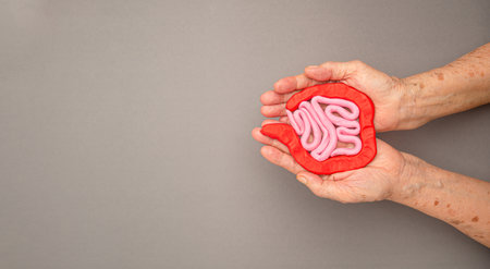 A large intestine shape made from plasticine on a palm senior woman over a gray background. Treatment and prevention of constipation and diarrhea. Intestinal microflora and probiotics. Space for text