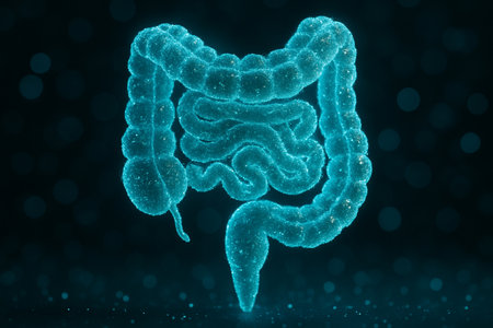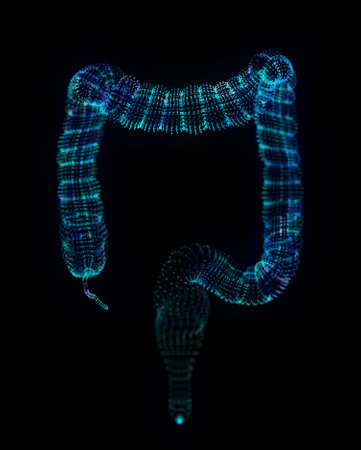 AI generated digital rendering of human intestines glowing with bioluminescent particles on a dark bokeh background showcasing futuristic medical technology