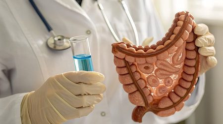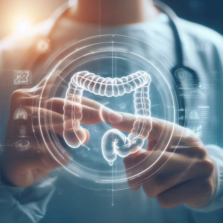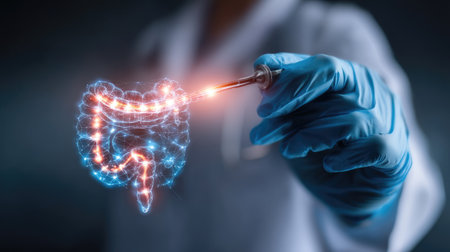A medical professional in blue gloves applies advanced laser technology to a glowing representation of the human digestive system, illustrating innovative treatment methods.