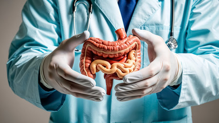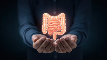 This image showcases a 3D digital illustration of the human digestive system, artistically held in hands, symbolizing health, wellness, and medical innovation.