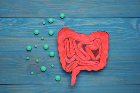 Paper cutout of small intestine and pills on blue wooden background, flat lay