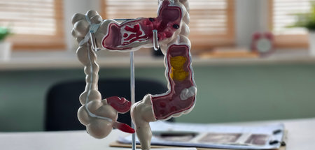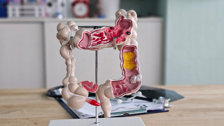Detailed anatomical model of the human digestive system displayed during a medical consultation in a clinic