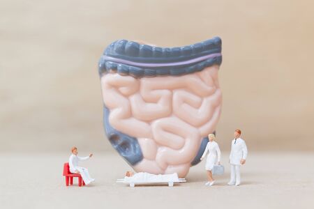 Miniature people ; doctor and nurse team specialists observing and discussing about human Intestine , Science and Medical Concept