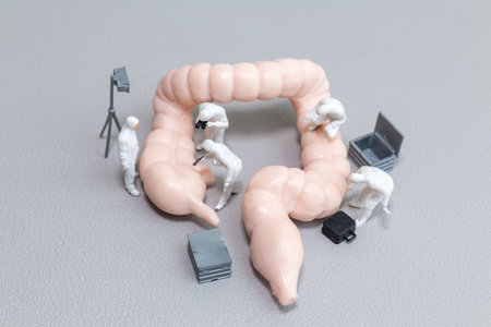Tiny figures in hazmat suits examine a model of the human intestine, symbolizing gut health, microbiome research, and medical exploration