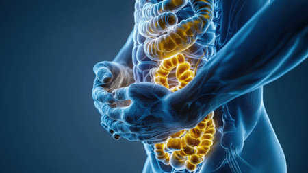 A person holding their stomach with a yellowish color. The stomach is shown in a blue color