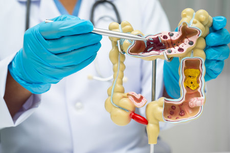 Intestine, doctor holding human anatomy model for study diagnosis and treatment in hospital.