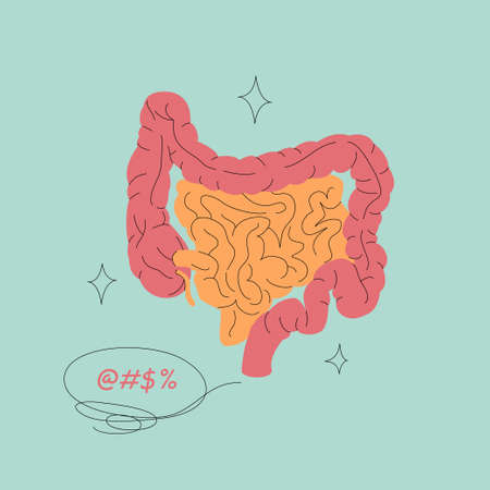 Human guts or intestines vector illustration isolated on blue background. Flat and outline design. Comic trendy style of anatomical image.