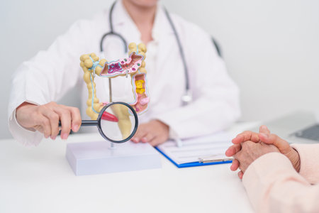 Elderly woman Patient consultation with doctor for Colon disease, Large Intestine, Colorectal cancer, Ulcerative colitis, Diverticulitis, Irritable bowel syndrome, Digestive system and Healthcare