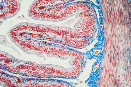 Small intestine with villi under the microscope 100x