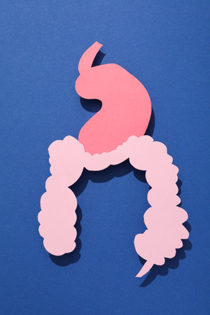 Close-up of hand holding a colon symbol and touching stomach painful suffering from stomachache causes of gastric ulcer, appendicitis, or gastrointestinal system disease. Space for text