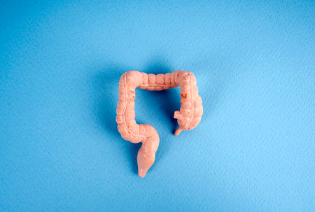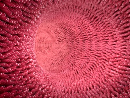 This medical illustration showcases a detailed view of the human intestines. It highlights the digestive system with vibrant colors and intricate textures. The composition employs a clear and informative style, possibly for educational or scientific purposes. This image may be suitable for use in medical publications or educational resources.
