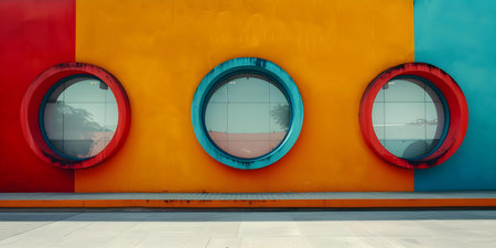 A concrete wall with three circular windows and a horizontal yellow stripe.