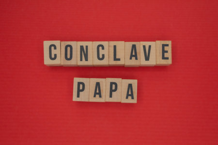 Words CONCLAVE and PAPA formed with wooden blocks on deep red background
