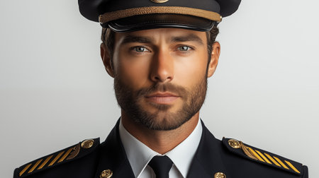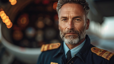 Confident middle aged airline pilot with a beard is wearing his uniform inside the cockpit