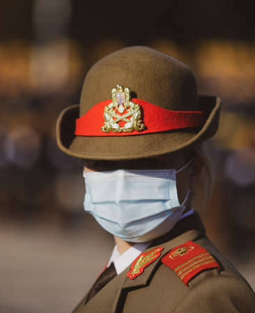 Bucharest, Romania - October 25, 2021: Portrait of a female Romanian soldier wearing a protective mask during an outdoors ceremony on a sunny autumn day.