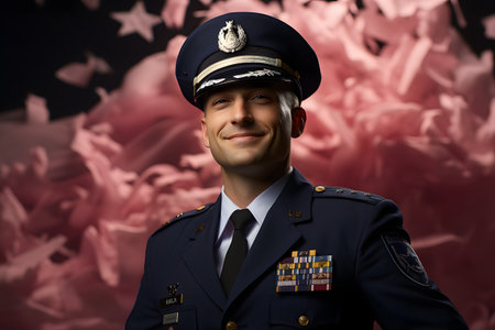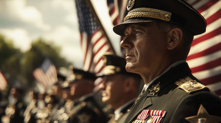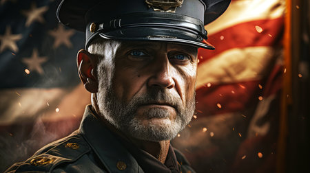 A solemn, uniformed veteran stands before a backdrop of an American flag, embodying patriotism and service with a determined expression.