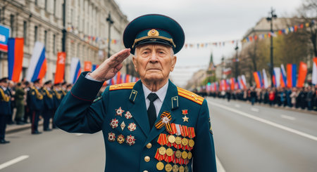 Close up of a respectful war veteran proudly wearing his military uniform and medals
