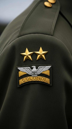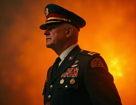 Confident Military Commander Overseeing Troops with Stern Expression During Tactical Operations Briefing.