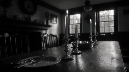 Candles illuminate a dining table set with plates and utensils in a quiet room during evening hours.